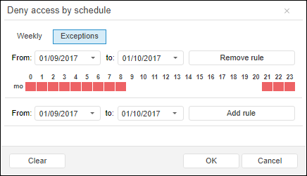 To remove the selected date range, click the Remove or Remove Rule button in the Set Access Time or Deny Access by Schedule dialog box.