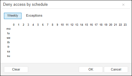 The table by days of week or days is displayed in the User Access Permissions by Date and Time or Deny Access by Schedule dialog box. One cell equals one hour of access on the specified day of the week, starting from the specified hour.