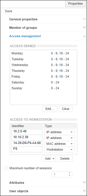To manage parameters of user access to the system, use the Access Management tab on the Properties side panel in the web application and in the User Properties dialog box in the desktop application: