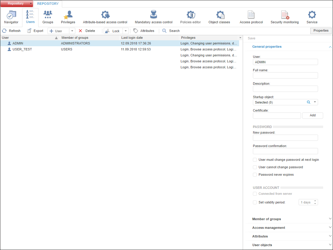 Users are security subjects of the system and have certain permissions to work with repository objects. Permissions can be obtained explicitly (if permissions are determined separately from users) and implicitly (if permissions are inherited from a group of users).