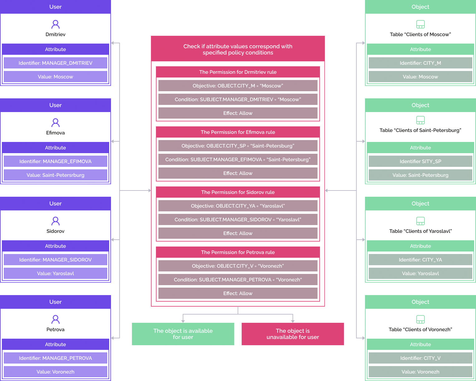 The access is restricted via policies and rules that contains a set of conditions to check attributes. This method provides the possibility to create combinations of conditions for expressing various policies. Granting user access to the object or data segment occurs only if the values of the user and object attributes allow the user to grant the access to the object.