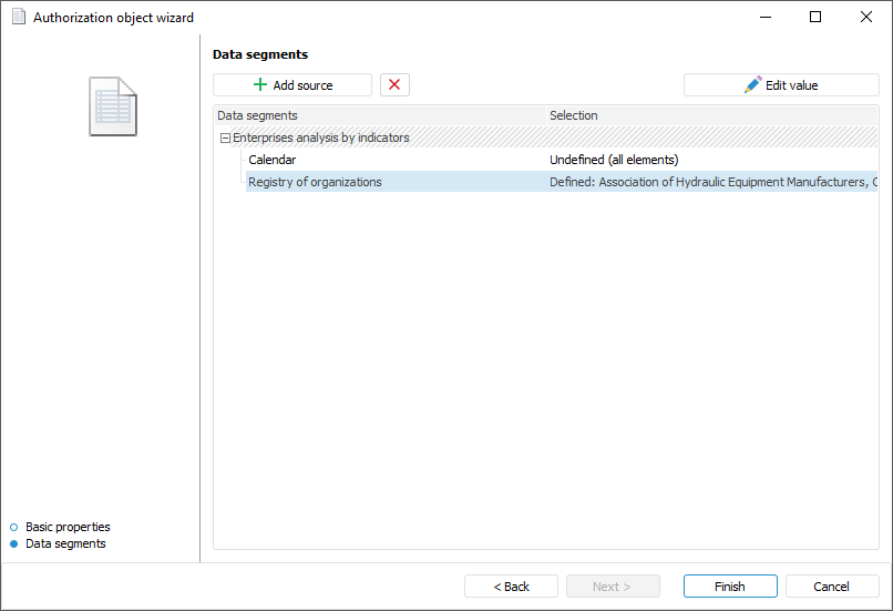 The next wizard page, Data Segments, is used to determine the list of data segments. Data segments are set by determining selections by dimensions of the selected source. It enables the user to divide data source into segments available for single groups of users work.