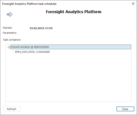 As a result, a new task scheduler instance is started that is configured to the Scheduler.xml configuration file. Check that the task scheduler dialog box displays a server, a repository, which processes will be executed on server, and a container with the BPM_EXECUTOR_CONTAINER identifier: