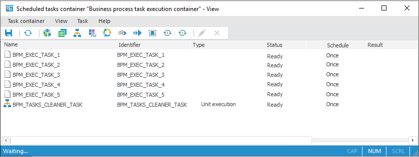 NOTE. If scheduled tasks container with the BPM_EXECUTOR_CONTAINER identifier is absent or empty, select the Initiate Task Container item on the Debug page of the Parameters Setup and Business Processes Administration dialog box.