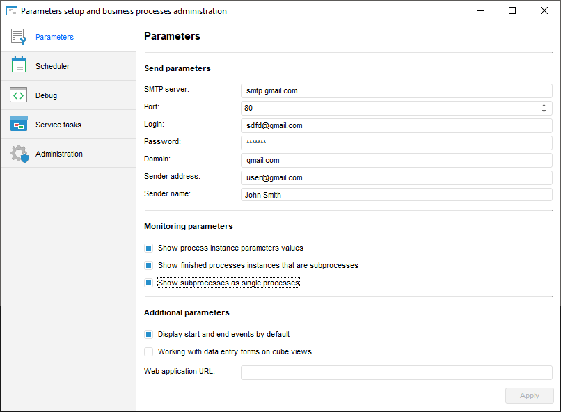 Parameters. Parameters of email notifications sending, monitoring parameters and additional parameters are set.