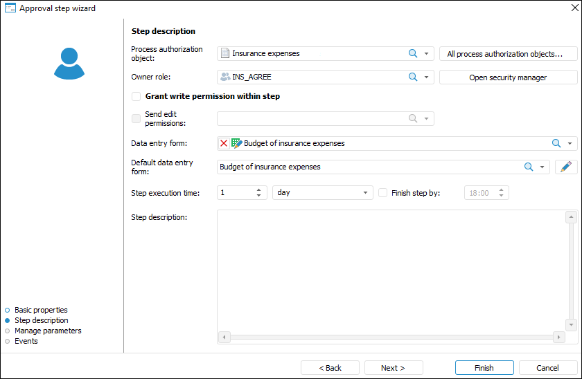 Step Execution Time. Specify the time, in which a step should be executed on process execution. Execution time is counted from step activation.