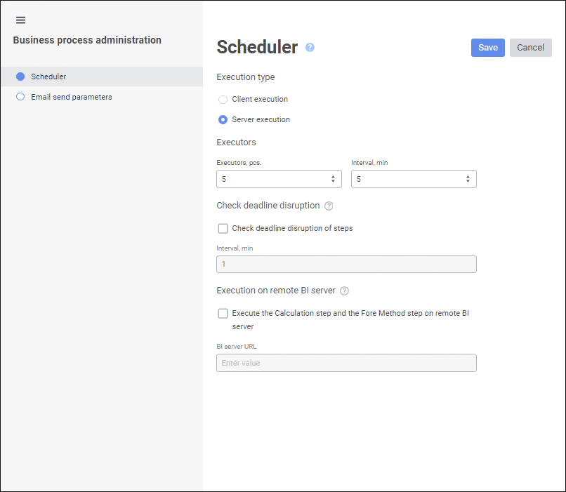 Setup of business process scheduler includes business processes execution type definition, parameters setup for processes server execution and BI service URL specification. To set up business process debugging, use the Scheduler page in the business processes administration wizard.