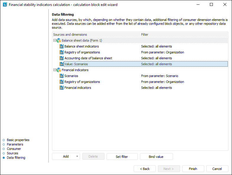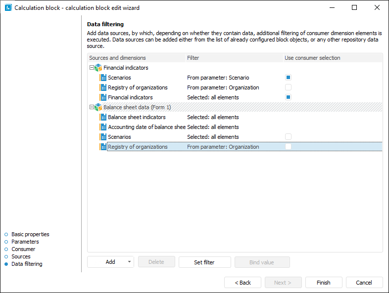 Data filtering is set up on the Data Filtering page in the calculation block editing wizard: