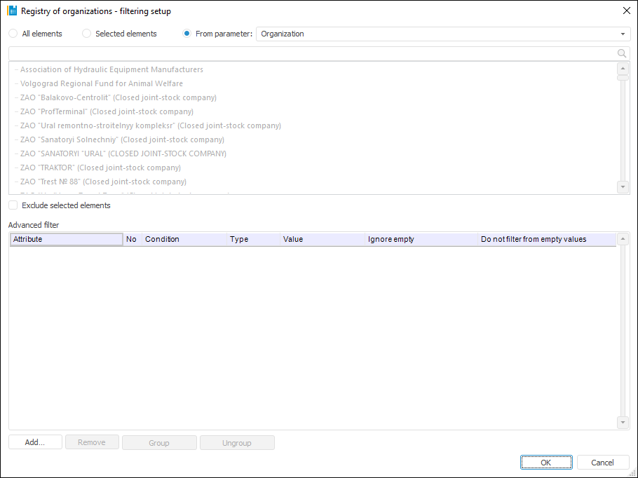 Filtering will be executed by all elements contained in the Selected Elements area. If it is required to execute calculation by all elements, except for those contained in the Selected Elements area, select the Exclude Selected Elements (N) checkbox, where N is the number of selected elements.