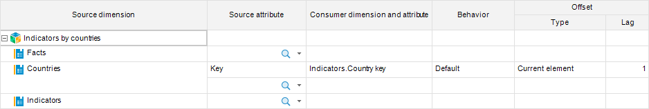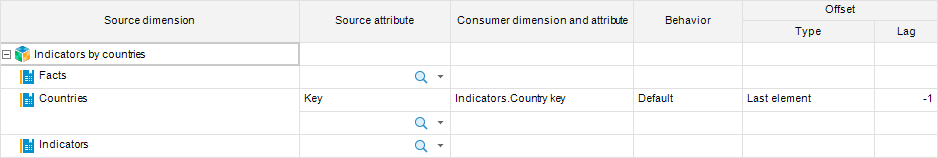 Set the number of elements, by which selection in the data source dimension is offset, in the Offset group in the Lag column. Specify offset mode in the Type column: