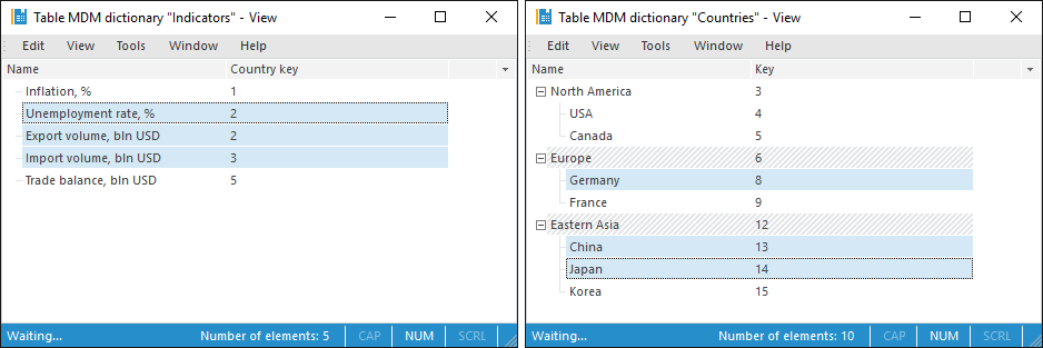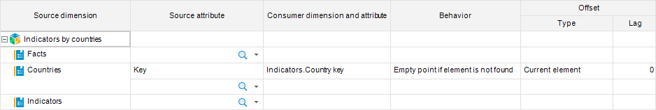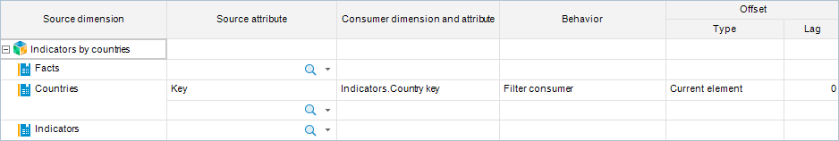 For example, there is the Indicators dimension in the data consumer and the Countries dimension in the data source. The dimensions contain the following data and the following selection: