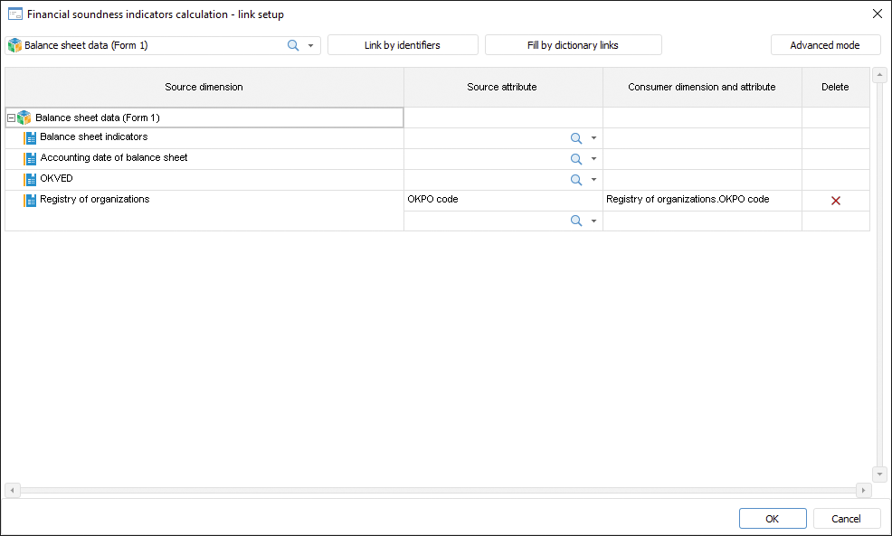 Attribute identifiers, click the Link by Identifiers button. Links are created for all equal dimensions in data sources and data consumers.