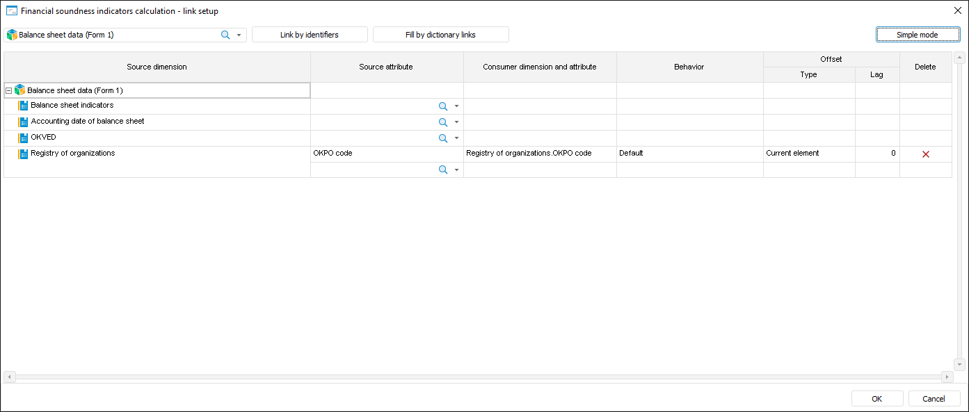 To set up links between data source and data consumer dimensions, use the Set Up Links dialog box. A link can be set up in various modes: simple and advanced. The dialog box appearance differs depending on the setup mode:
