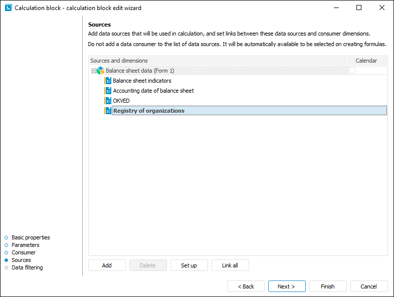 Data sources can be selected and set up on the Sources page in the calculation block editing wizard: