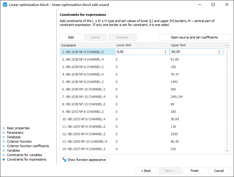 Set upper, lower constraint limits and controlling variable coefficients as well. Lower limit is a minimum allowed value of controlling variable, upper limit is a maximum allowed value of controlling variable. Coefficient is the element that is used to take into account impact of conditions change on criterion function calculation. The following can be set for each controlling variable: coefficient, only lower limit, only upper limit, both limits or no constraints.