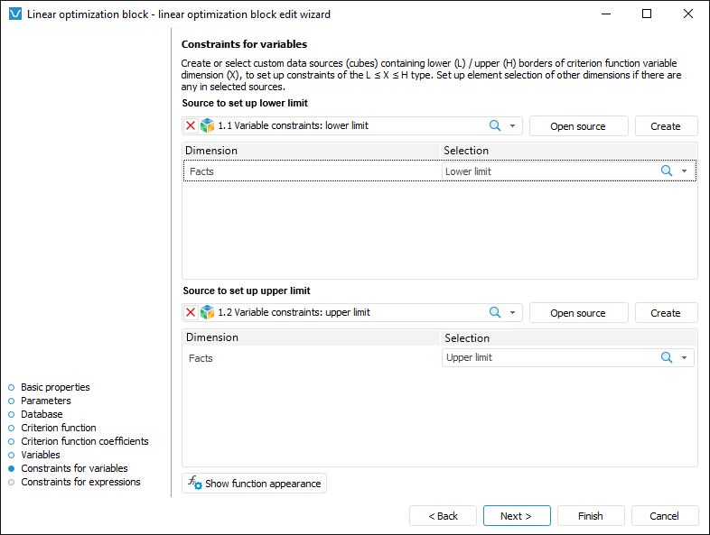 Set selection by fixed dimensions of data source. If a custom data source is selected, the fixed dimensions contain all data source dimensions except for those used as dimensions of controlling variables. If the data source is used that is created in the linear optimization block editing wizard, only the Facts dimension is fixed with the only Value element selected by default.