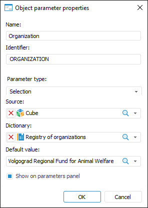Dictionary. Select the dictionary, to which the parameter is linked. Dictionary selection or alternative hierarchy will be used as parameter values. The box is available only for the parameters of the Selection and Hierarchy types, and it is mandatory for them.