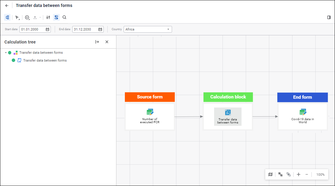 To calculate the entire algorithm, select the Start Calculation item in the drop-down menu of the