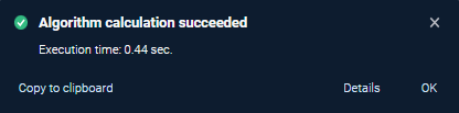 After the calculation is completed, the dialog box with successful algorithm completion and execution time opens. If an error occurred on calculation, the corresponding message is displayed.