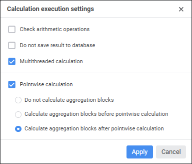 Multithreaded Calculation. Select the checkbox to speed up calculation of calculation blocks and control blocks if the Multithreaded Calculation checkbox is selected in the calculation block or control block editing wizard. Aggregation blocks are calculated only using single-threaded calculation. For details about multithreaded calculation see the How to Execute Multithreaded Calculation? section.. The checkbox is deselected by default, and single-threaded algorithm calculation is executed.