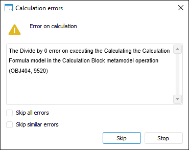 To skip the error, click the Skip button. After this calculated elements will be skipped and the calculation result is the empty value.