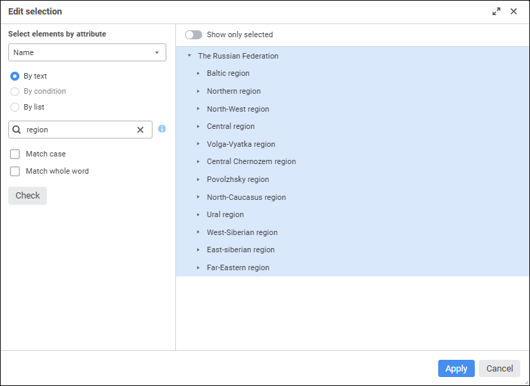 Click the Check button to selected the elements matching the search criterion in the dimension element display area. To display only selected elements, toggle the Show Only Selected switch to active state. If only child elements are selected, they will be displayed with parent elements.