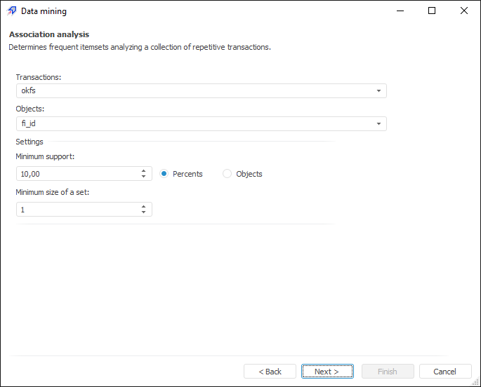 In other words, the purpose of this analysis is establishing the following dependencies: if an X set of elements is found in the transaction, it can be concluded that another Y set of elements should also be found. Establishing these dependencies enables finding simple and intuitive rules.