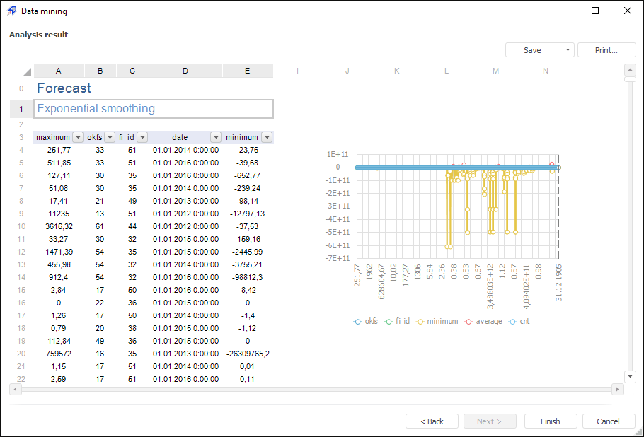 This type of analysis continues the specified time series by the selected forecasting method using information on its frequency.