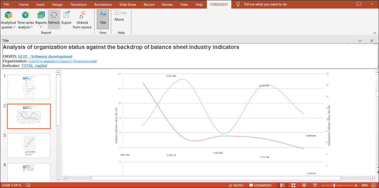 The Foresight PowerPoint Add-in add-in enables the user to work with Foresight Analytics Platform using Microsoft PowerPoint as a workspace. It is used to create presentations based on reports using the Analytical Queries (OLAP), Time Series Analysis, Reports tools.