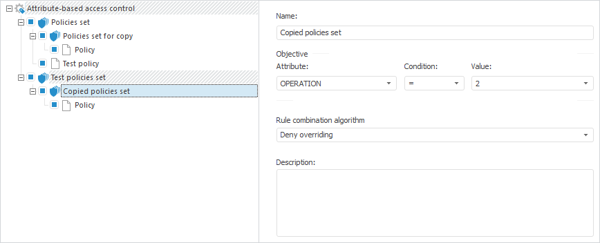 To execute the example, make sure that attribute-based access control structure contains two policies sets. The first policies set contains an additional nested policies set.