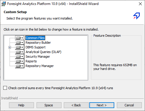 The Check Control Sums Every Time Foresight Analytics Platform Runs checkbox determines whether integrity check of Foresight Analytics Platform is executed. When the checkbox is selected, checksums are performed for executable files during their loading. At each startup of Foresight Analytics Platform, the system loads a minimum set of executable files, and additional libraries required for work are loaded on use of the corresponding functionality. The checkbox is deselected by default, and integrity check of Foresight Analytics Platform is not executed. The option value is applied only for the installed release.