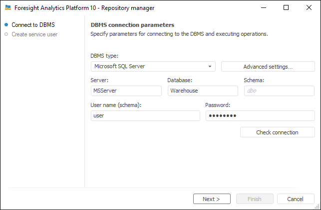 Password. Enter service user password. For the Microsoft SQL Server DBMS, a password should meet the requirements for password complexity.