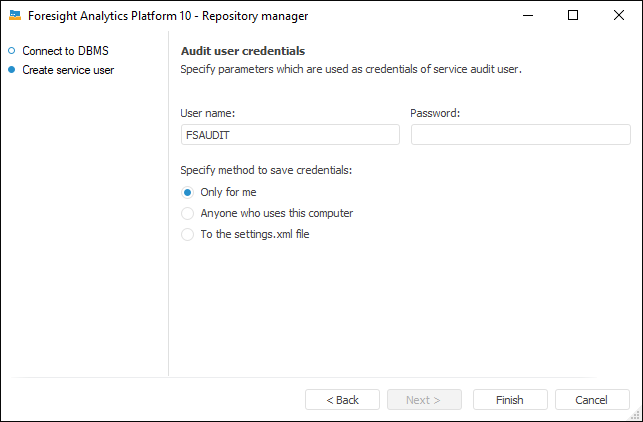 Only for Me. Credentials will be stored in the registry key of the current user - [HKEY_CURRENT_USER\SOFTWARE\Foresight\Foresight Analytics Platform\10.0\Audit\Credentials\Item0] - and are available only for the current computer user.