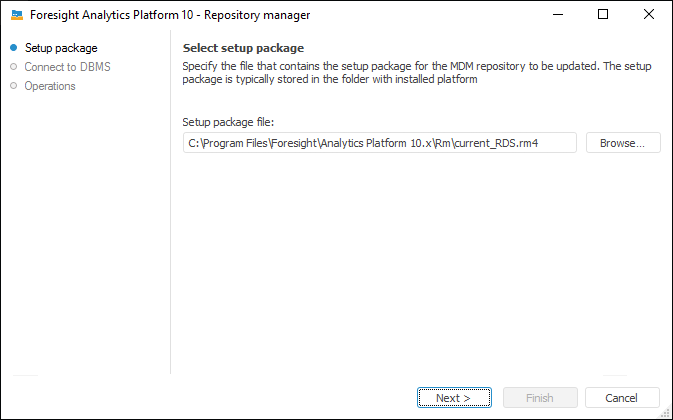 The path to the *.rm4 file, which stores executable scripts, is selected automatically. This file is included in the standard installation package and is located at S\Rm\current_RDS.rm4, where S is a path to the folder with installed Foresight Analytics Platform.