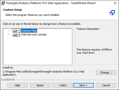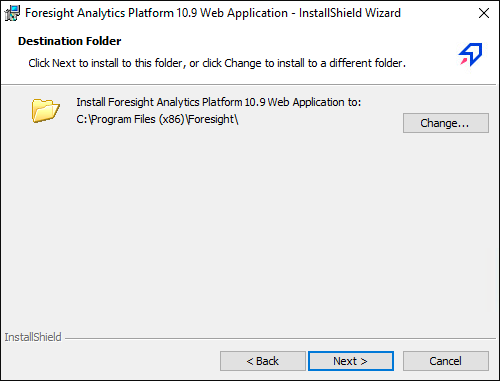 At the next step the installation wizard prompts the folder, in which Foresight Analytics Platform web application is installed. The folder: C:\Program Files (x86)\Foresight\ or C:\Program Files\Foresight\ depending on the operating system bitness. Click the Change button to change the installation folder.
