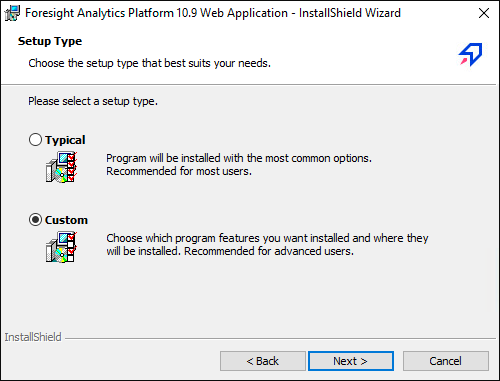 On the next page, select the radio button of the required setup type. The typical installation is executed by default. The custom installation allows for selecting component to be installed, including web service console.