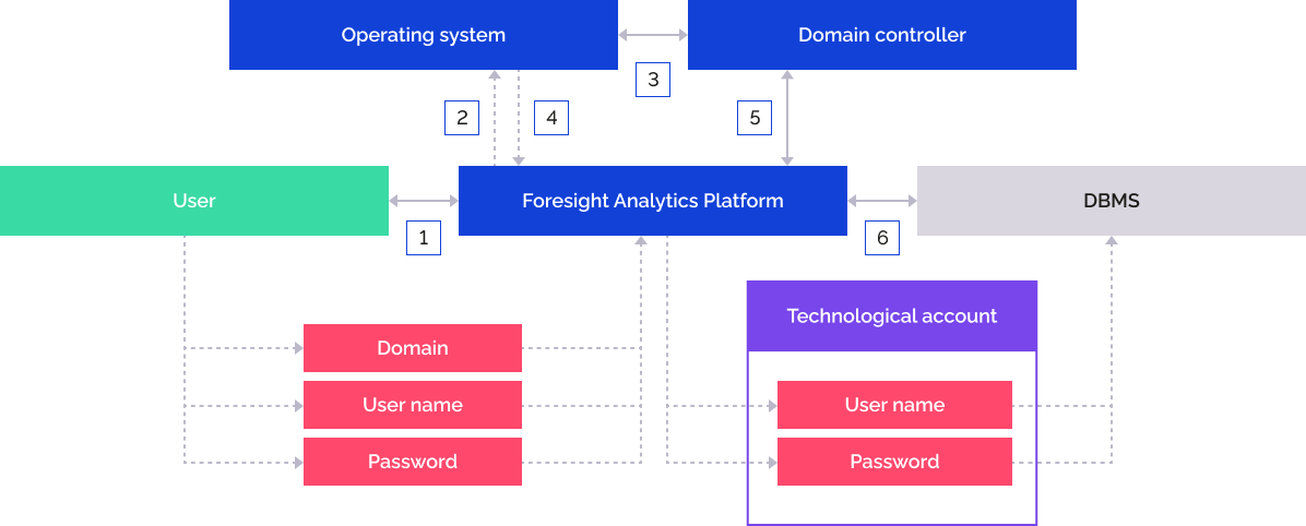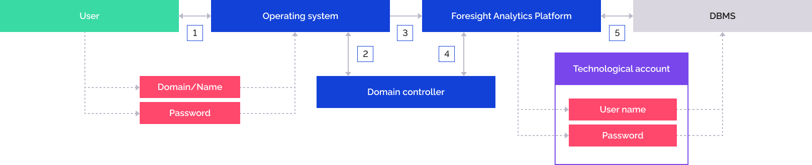 User authorization and DBMS connection are executed using technological account. User permissions are checked at the level of Foresight Analytics Platform. Technological account credentials are stored in encrypted form.
