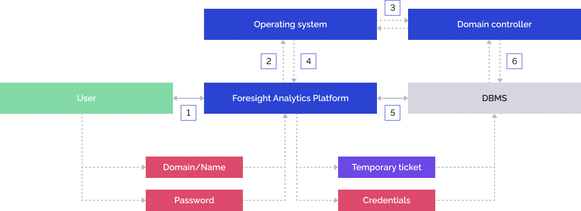 DBMS addresses the domain controller, the domain controller checks correctness of the specified data and grants Foresight Analytics Platform permission to connect under the domain user by means of a temporary ticket.
