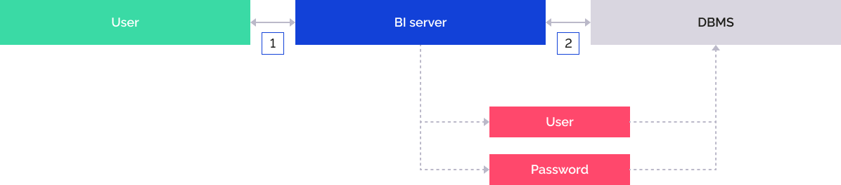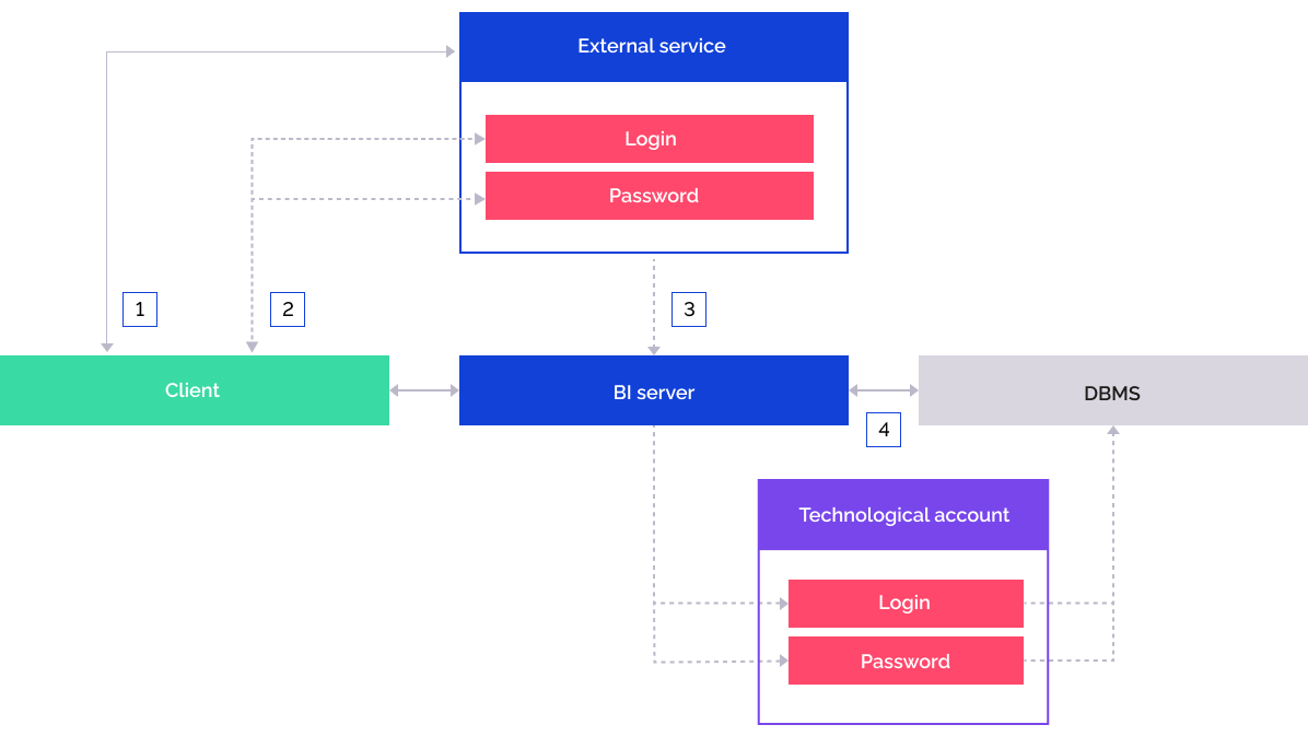 The BI server addresses the DBMS by means of the previously saved technological account.