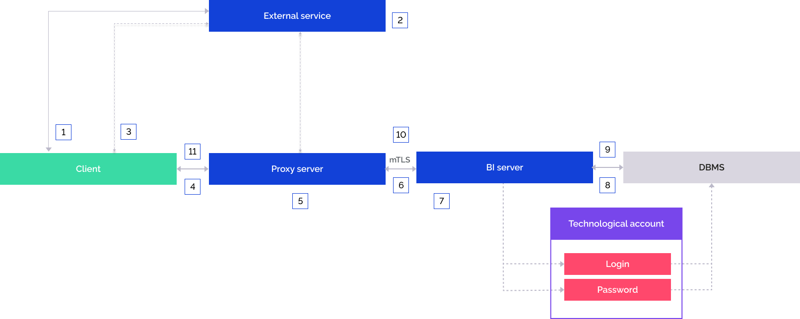 The appended query is sent to the BI server. An mTLS connection should be set up in advance between the proxy server and the BI server.