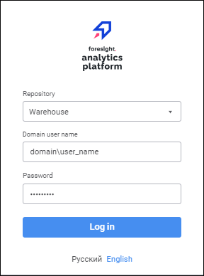 2. Log in to the system using the domain user name. In the login dialog box select the repository, enter domain user name in the format: domain\name and password: