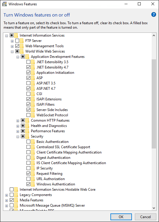 Authentication. Enable the ASP.NET Impersonation and the Windows Authentication settings, the rest of the settings should be disabled. The user can enable the Basic Authentication setting instead of the Windows Authentication setting.