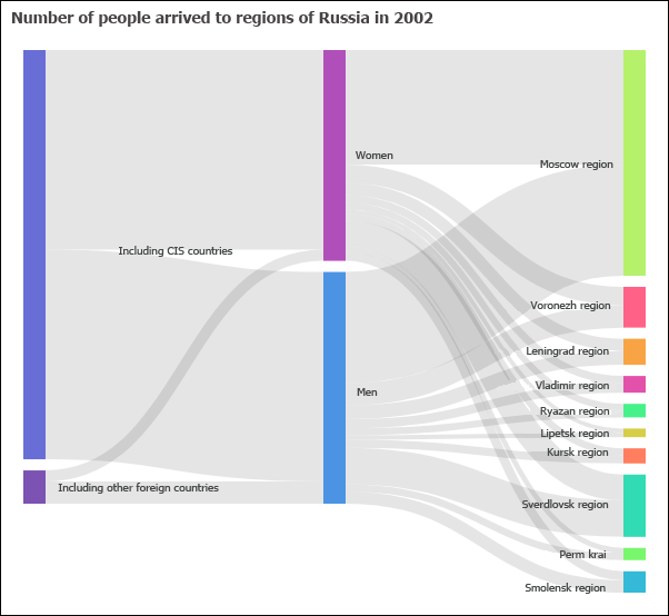 Width of lines (streams) is used to display values: the wider is the stream, the greater is its quantitative value. Stream lines can join or split on different chart levels, which allows for visual displaying of values distribution by different categories. Streams and division into categories are also highlighted with different colors using gradient fill.