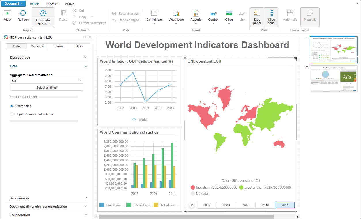 Creating a sketch of the slide, inserting and setting up visualizers, reports, interactive controls, plugins and other blocks to the slide is executed similarly to the operations with a dashboard.