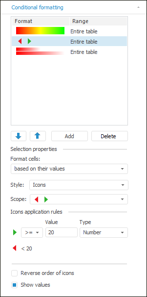 NOTE. Take into account the following feature of the scales used for conditional formatting: boundary values are always included into the smaller scale interval. For example, there is a scale with three intervals: less than 25, from 25 to 50, greater than 50. The 25 value will be in the Less Than 25 interval, the 50 value will be in the From 25 To 50 interval.