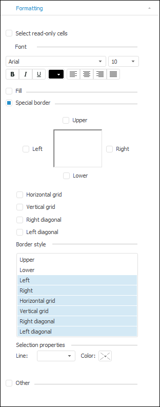 To display the border, select the Special Border checkbox. Border settings for the selected table element are available: