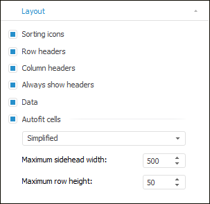 Row Headers. It determines whether table sidehead is displayed. The checkbox is selected by default, the sidehead is displayed.