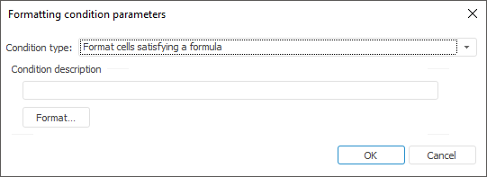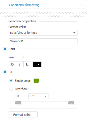 To set up formatting of the cells satisfying the specified formula, use the Conditional Formatting tab on the side panel or the Formatting Condition Parameters dialog box.