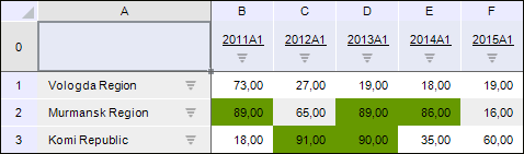 For example, the cells with values that satisfy the formula Value>B1 are formatted in the table: