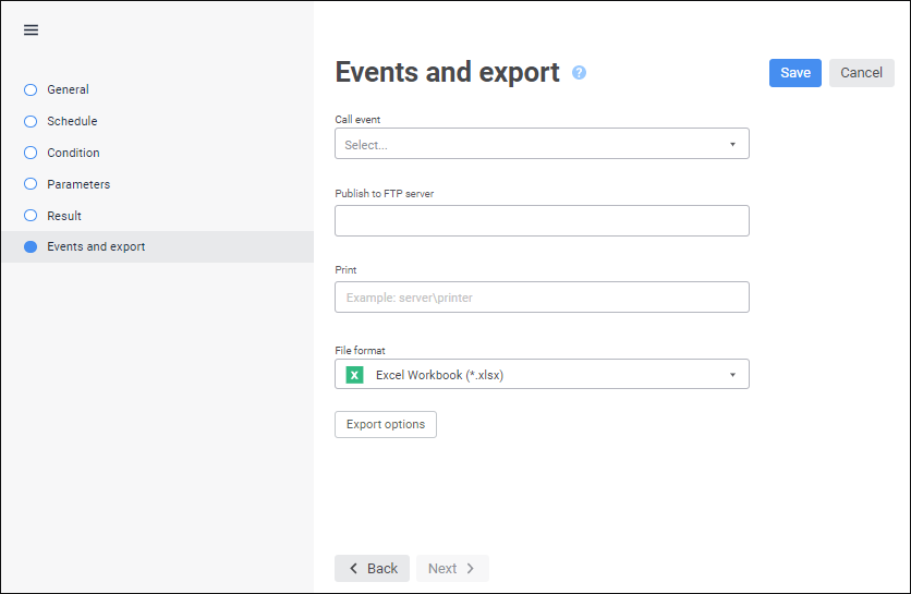 NOTE. For the report sent by email and/or published to an FTP server the following formats are available: XLSX, XLS, PDF, PNG in the web application; XLSX, XLS, PDF, RTF, HTM, ODS, EMF, PPREPORT in the desktop application.